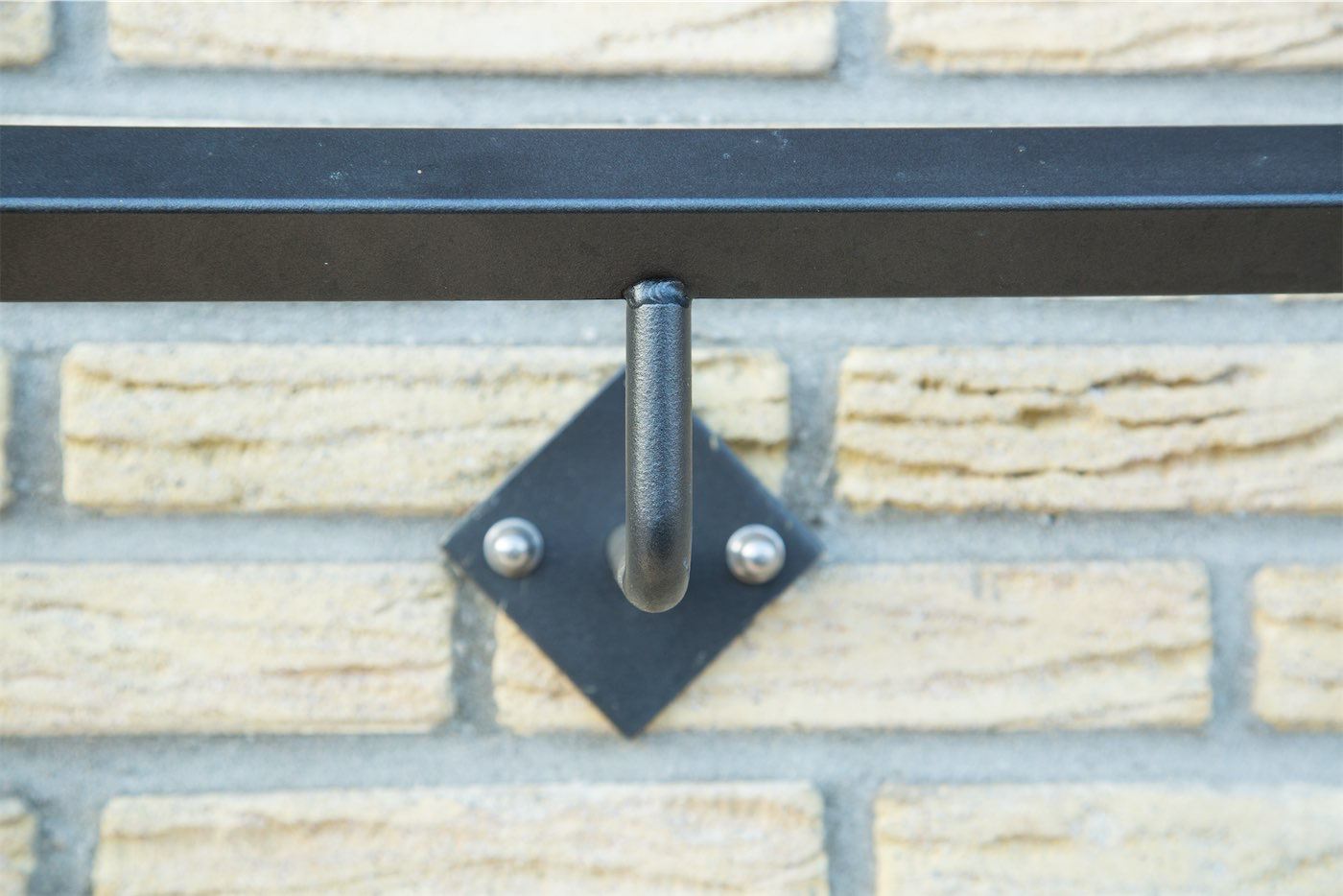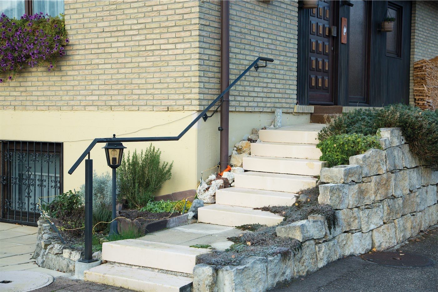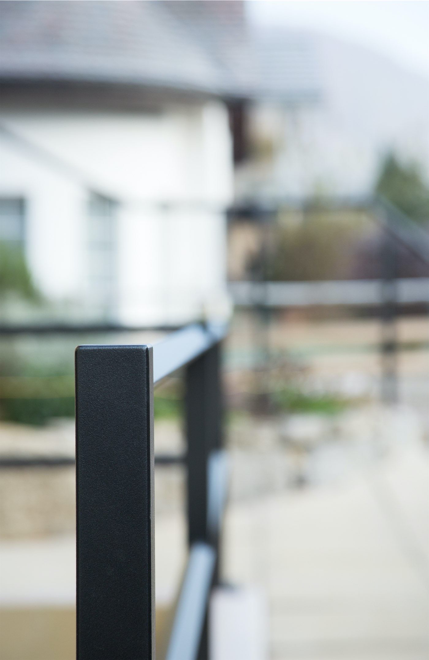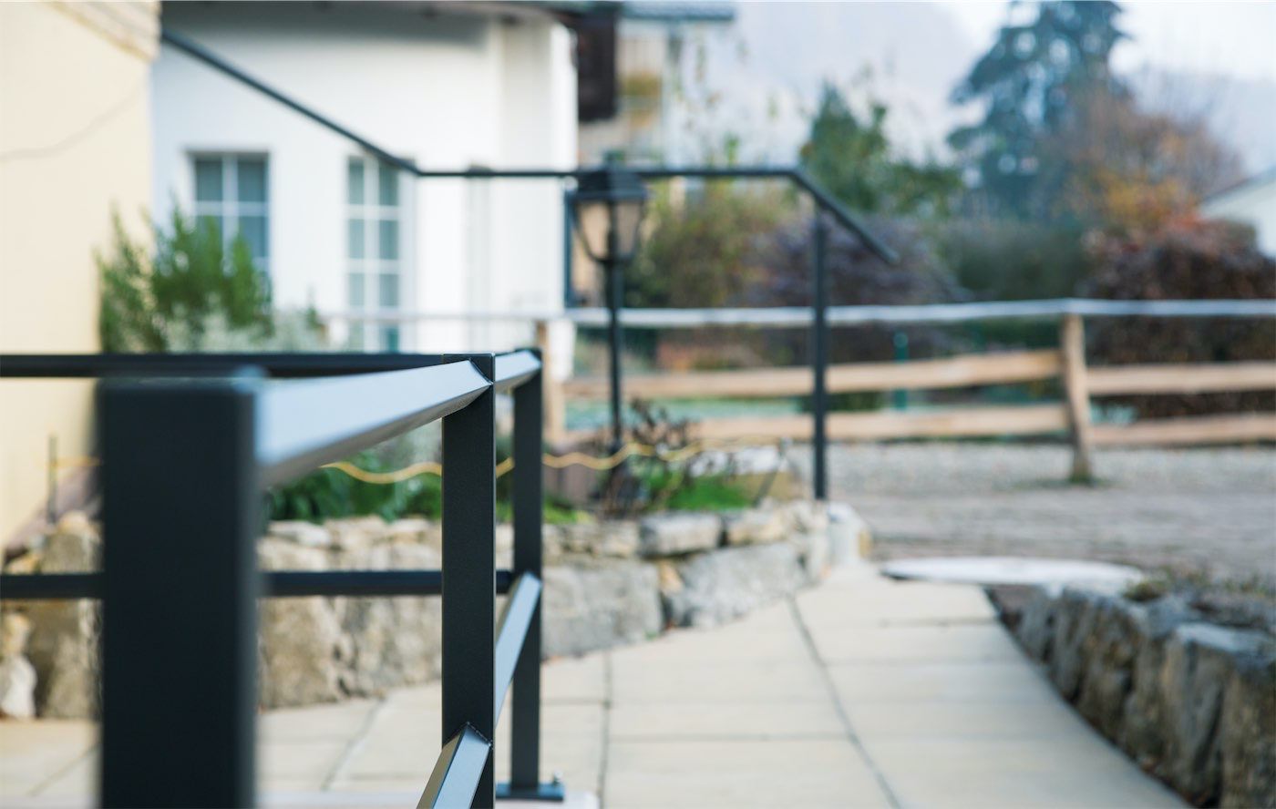 Traversengeländer bei Kellerabgang und Handlauf zu Aussentreppe. Aus Edelstahl rostfrei, pulverbeschichtet mit Strukturlack Eisenglimmer.