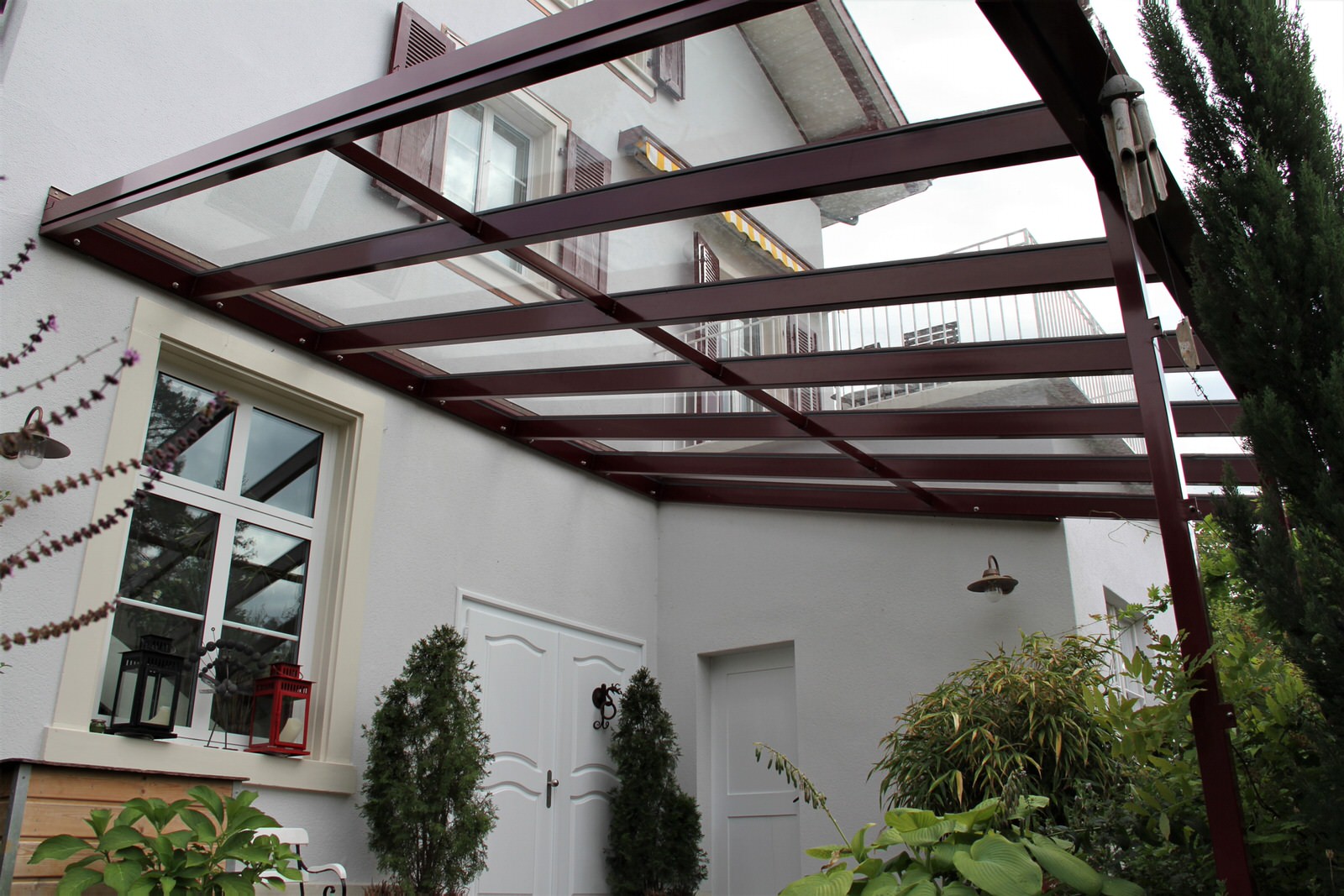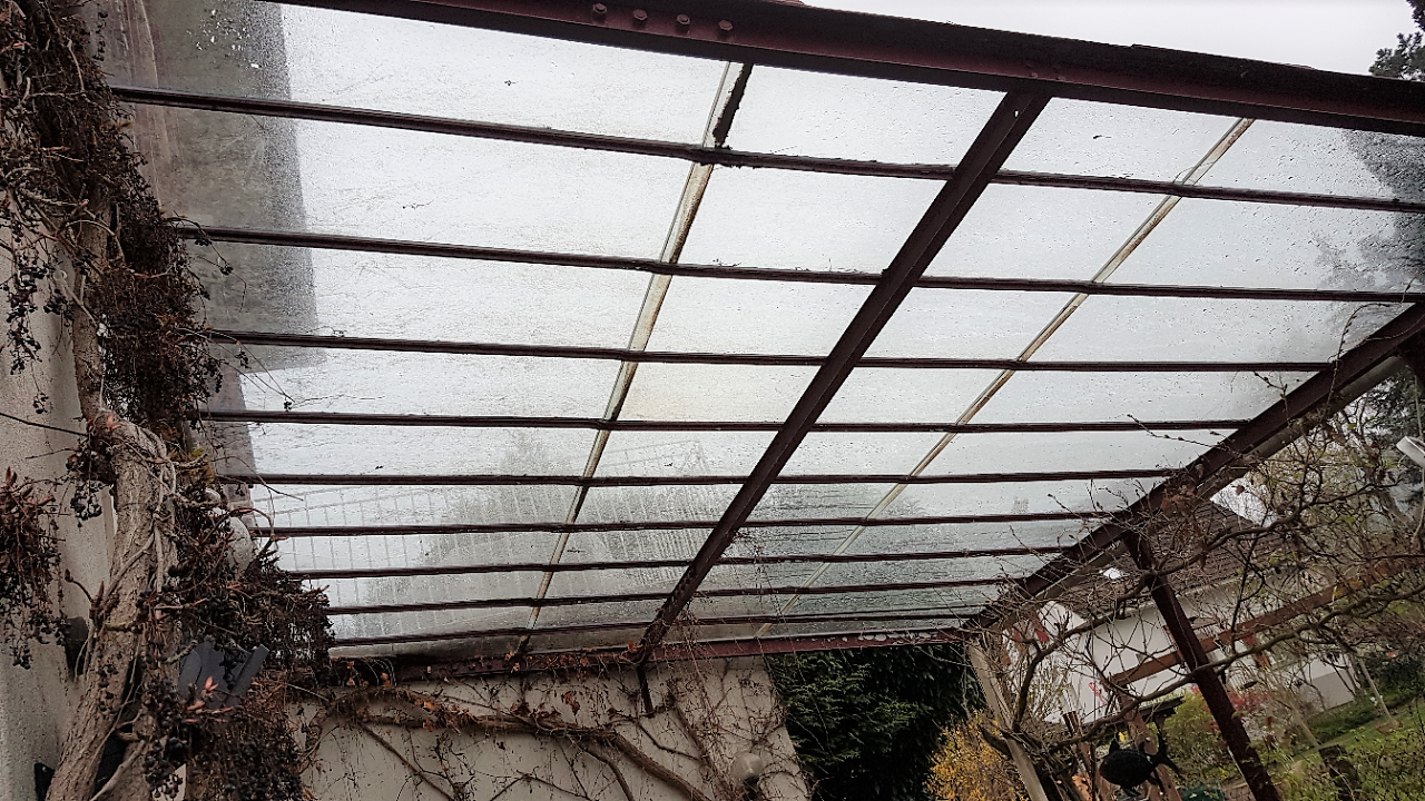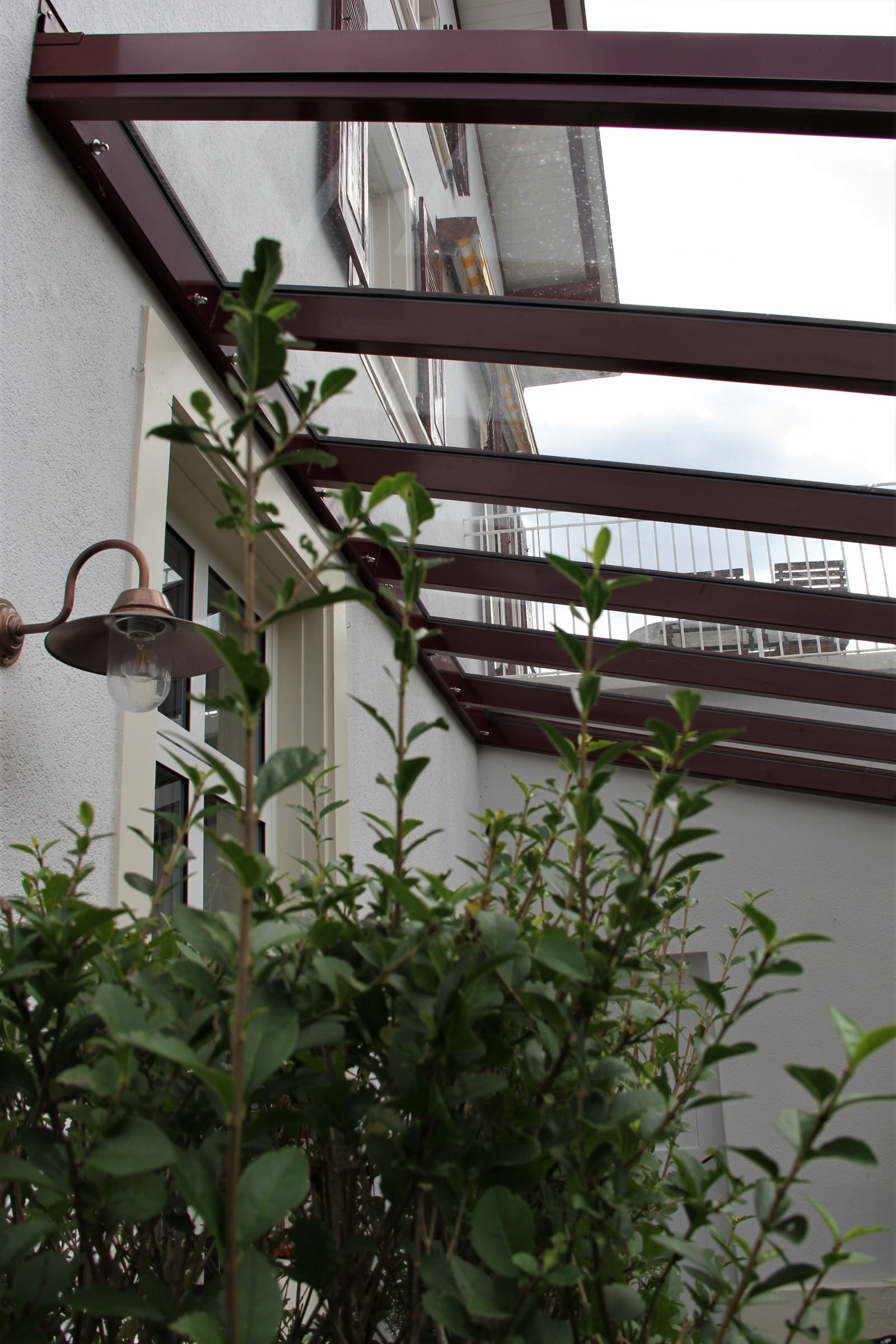 Bestehendes Dach vorgängig demontieren. Neues Pultdach aus Sicherheitsglas mit Aktivbeschichtung (Selbstreinigungseffekt) montieren. Mit Dachrinne und Fallrohr. Montiert an die Hauswand und vorne abgestützt