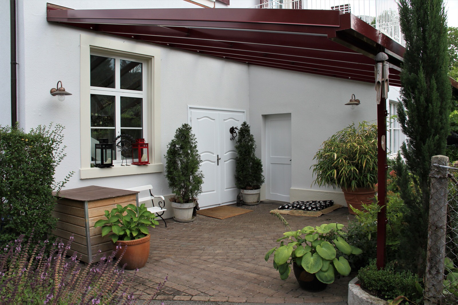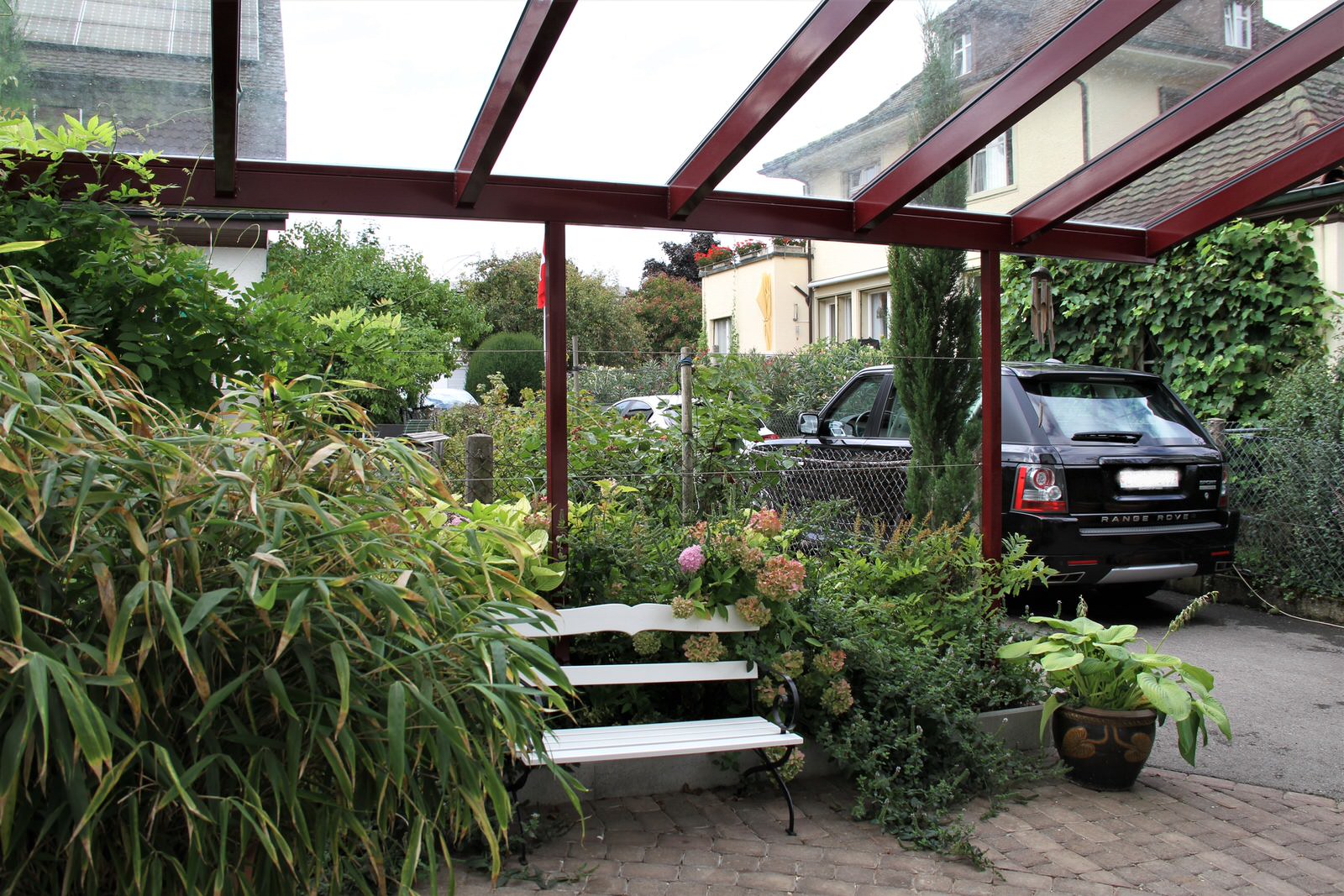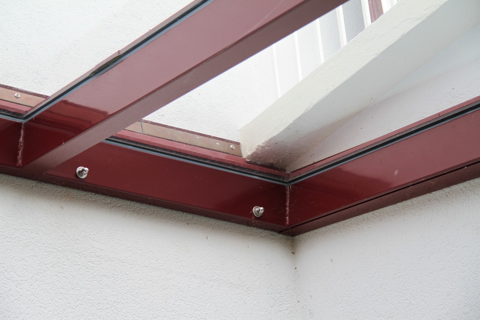 Bestehendes Dach vorgängig demontieren. Neues Pultdach aus Sicherheitsglas mit Aktivbeschichtung (Selbstreinigungseffekt) montieren. Mit Dachrinne und Fallrohr. Montiert an die Hauswand und vorne abgestützt