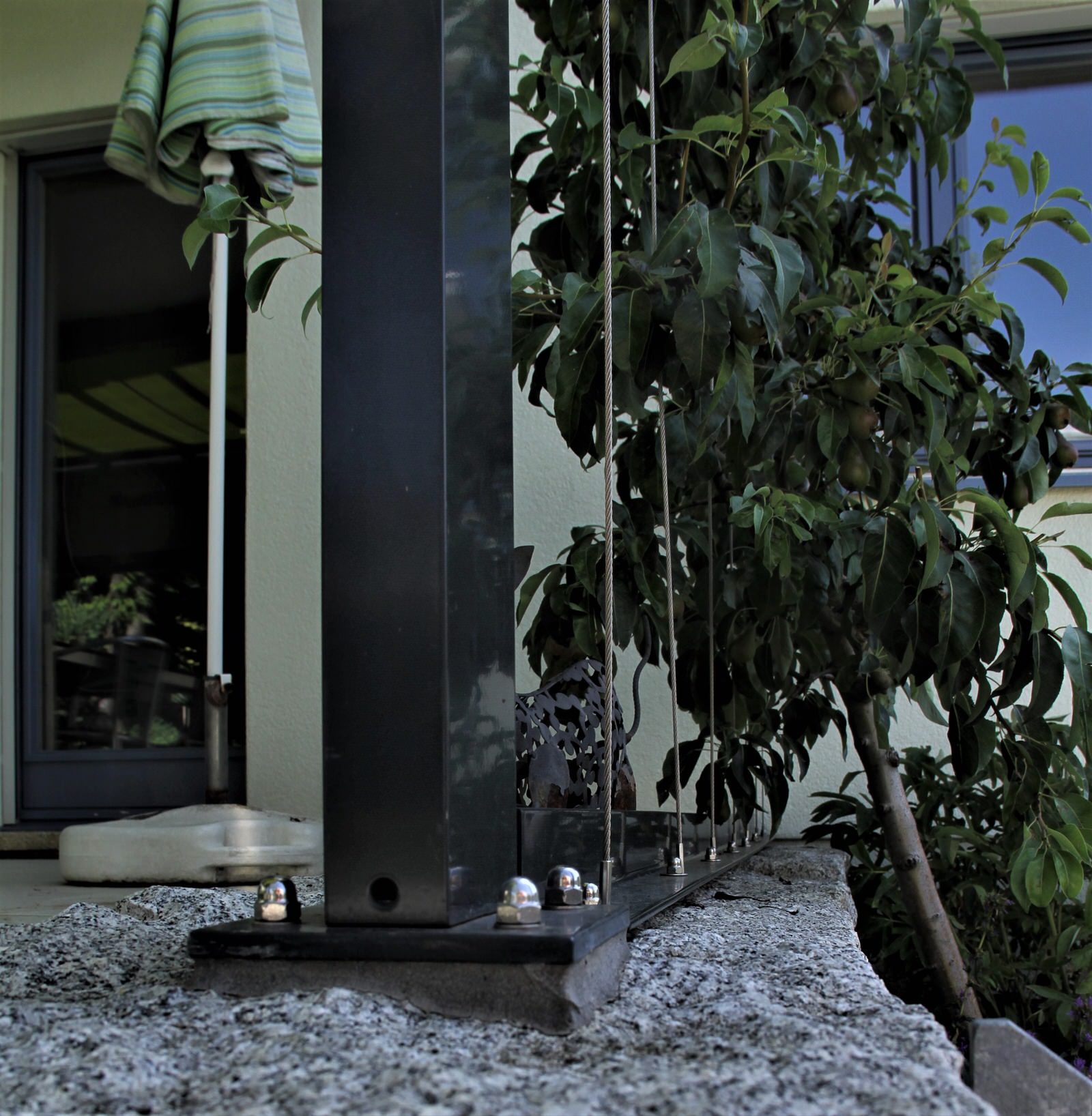 Seitlich senkrecht gespannte Edelstahldrahtseile. Oben in Pergolakonstruktion befestigt. Unten in Edelstahlwinkel verbohrt und mit Klebeanker auf Bruchsteinmauer befestigt. Die Drahtseile sind für den Pflanzenbewuchs vorgehsehen.