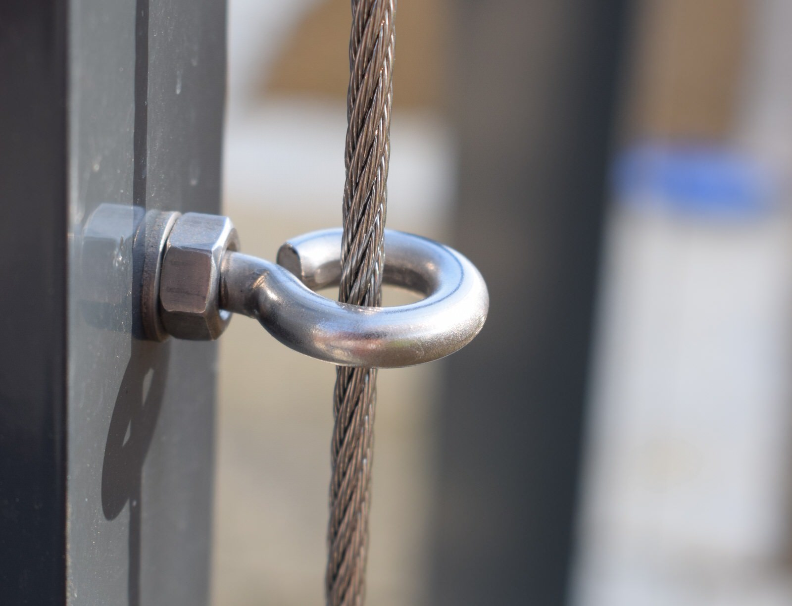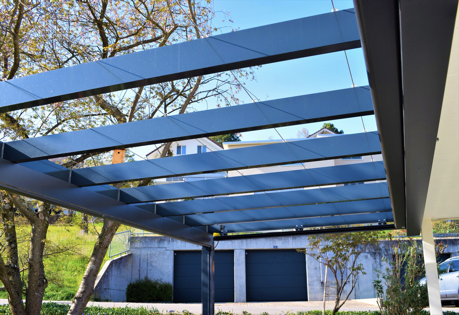 Längs gespannte Edelstahldrahtseile montiert. Drahtseile über die Sparren und durch Ringschrauben geführt.