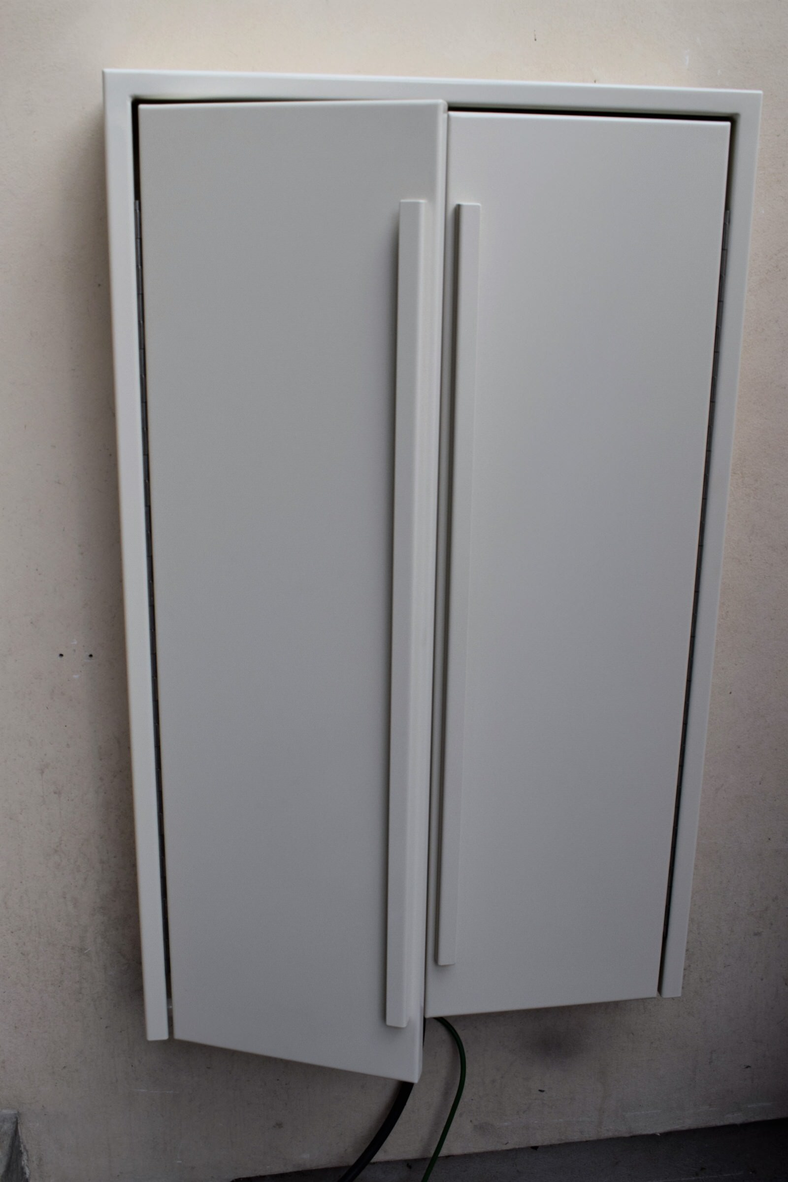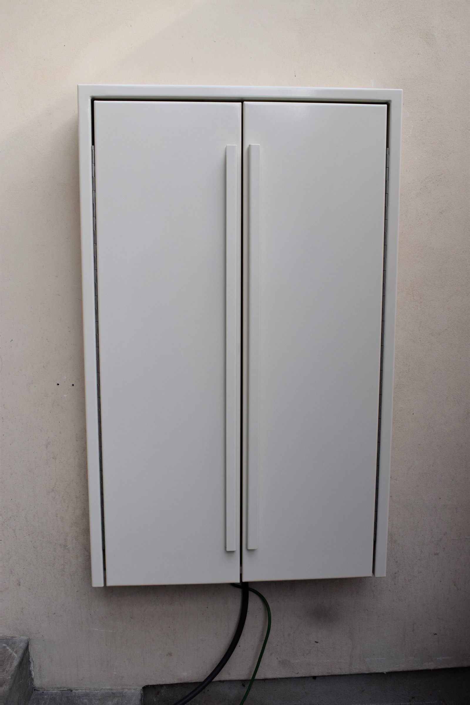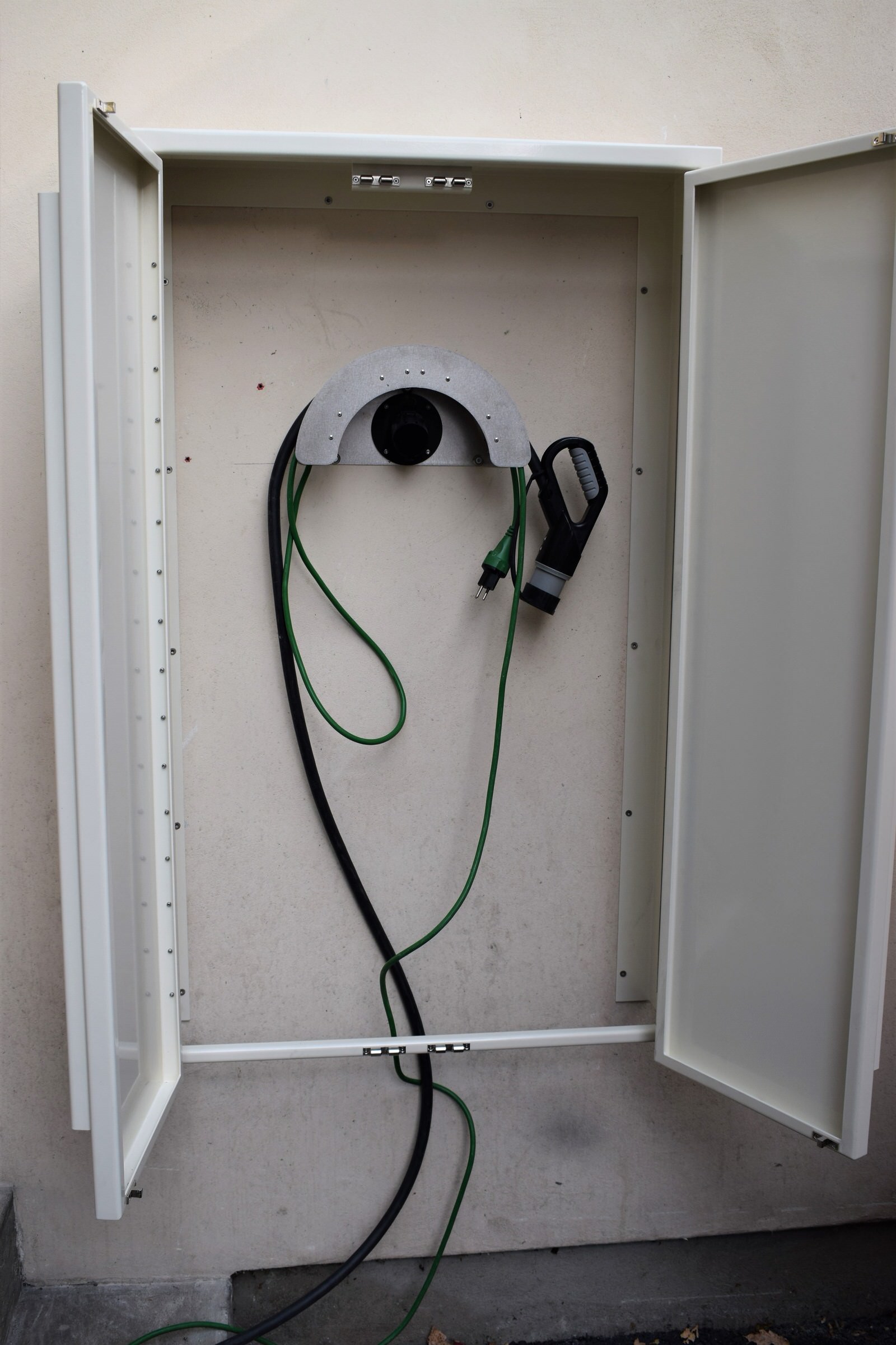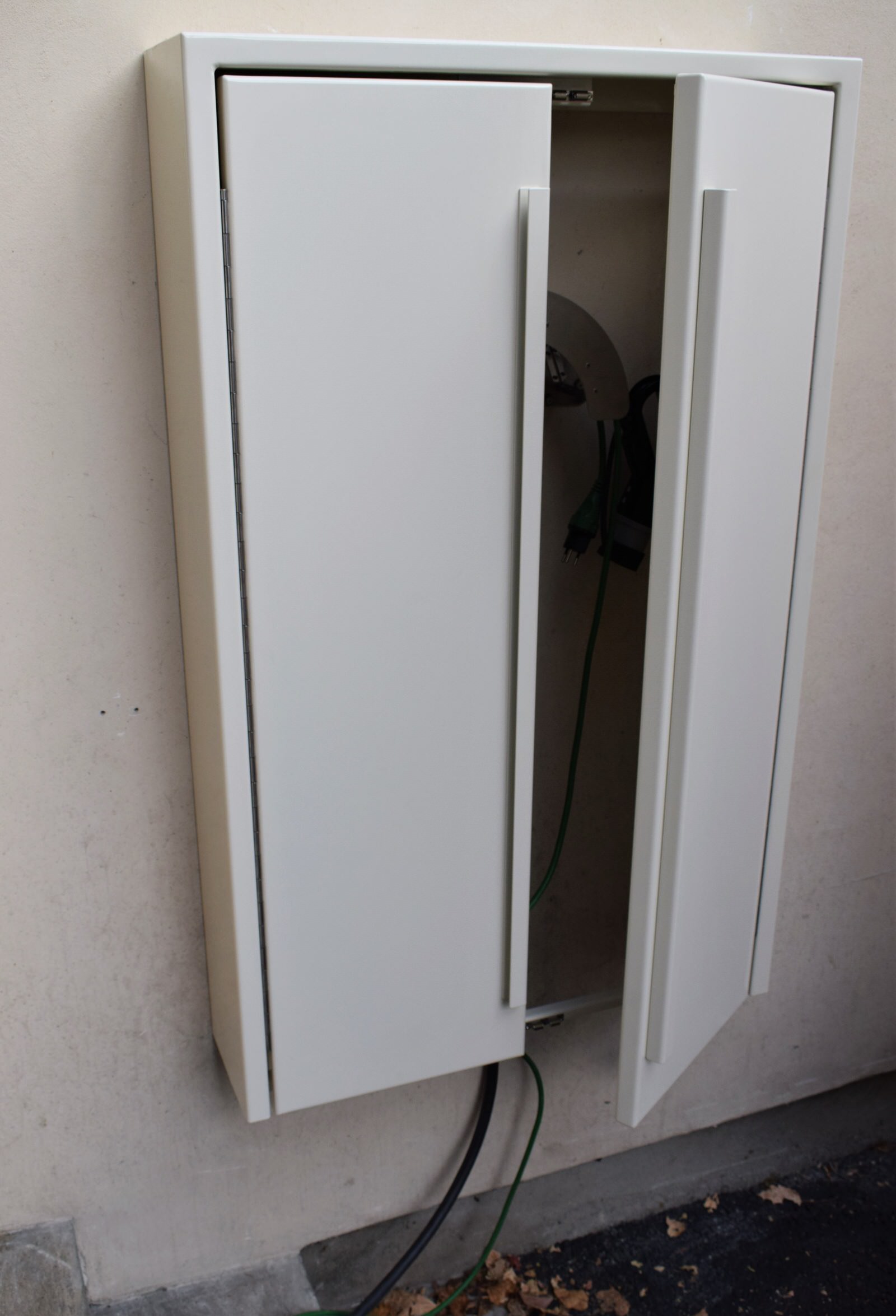 Aus Abkantblechen zusammengebaut. 2 Stk. Türli mit Schnäpper als Arretierung inkl. Bediengriff. Unten offen damit das Ladekabel zum Laden nicht in der Türe eingeklemmt wird. Rückseite ist offen, dadurch muss der Kabelhalter nicht umgebaut werden. Montiert an Hauswand. Lackiert in RAL1013 Perlweiss.