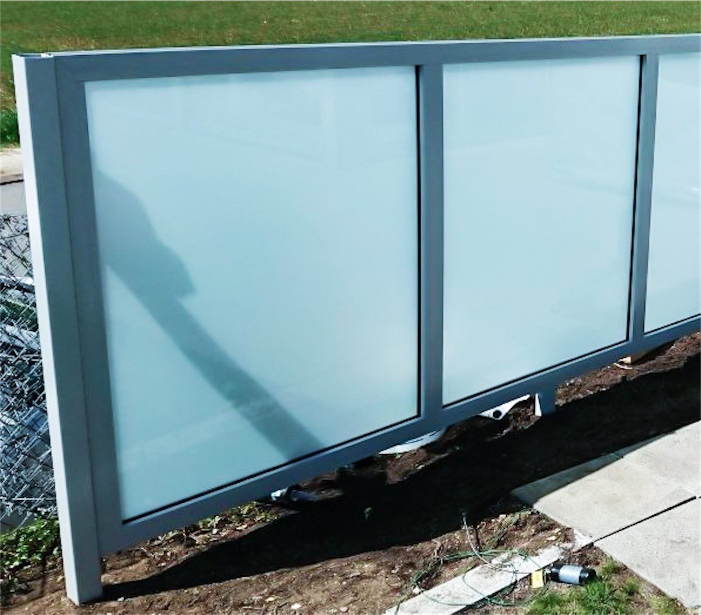Sichtschutz aus Sicherheitsglas mit matter Folie. Aluminiumprofile lackiert in RAL9006 Weissaluminium. Auf Schraubfundament System Krinner montiert.