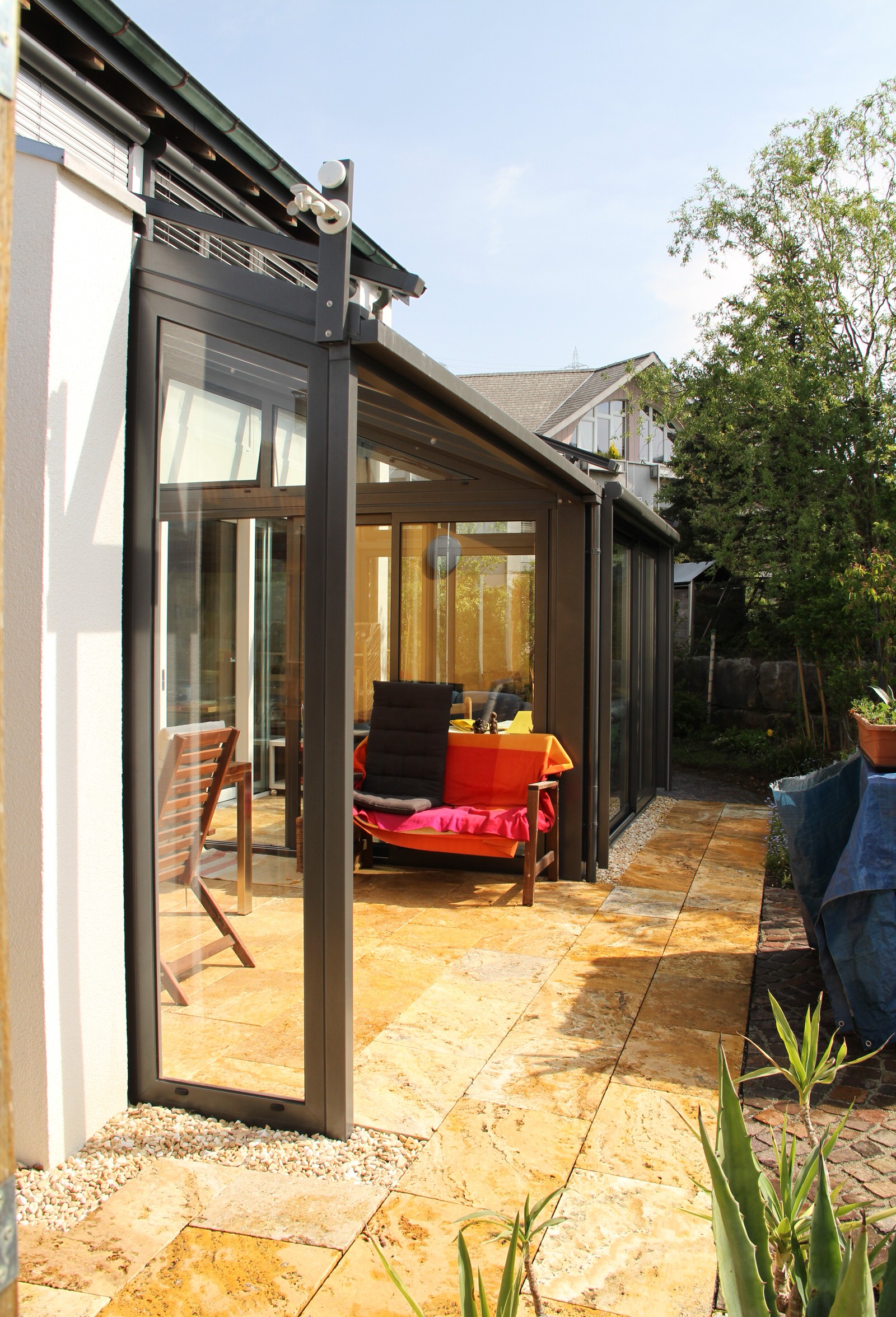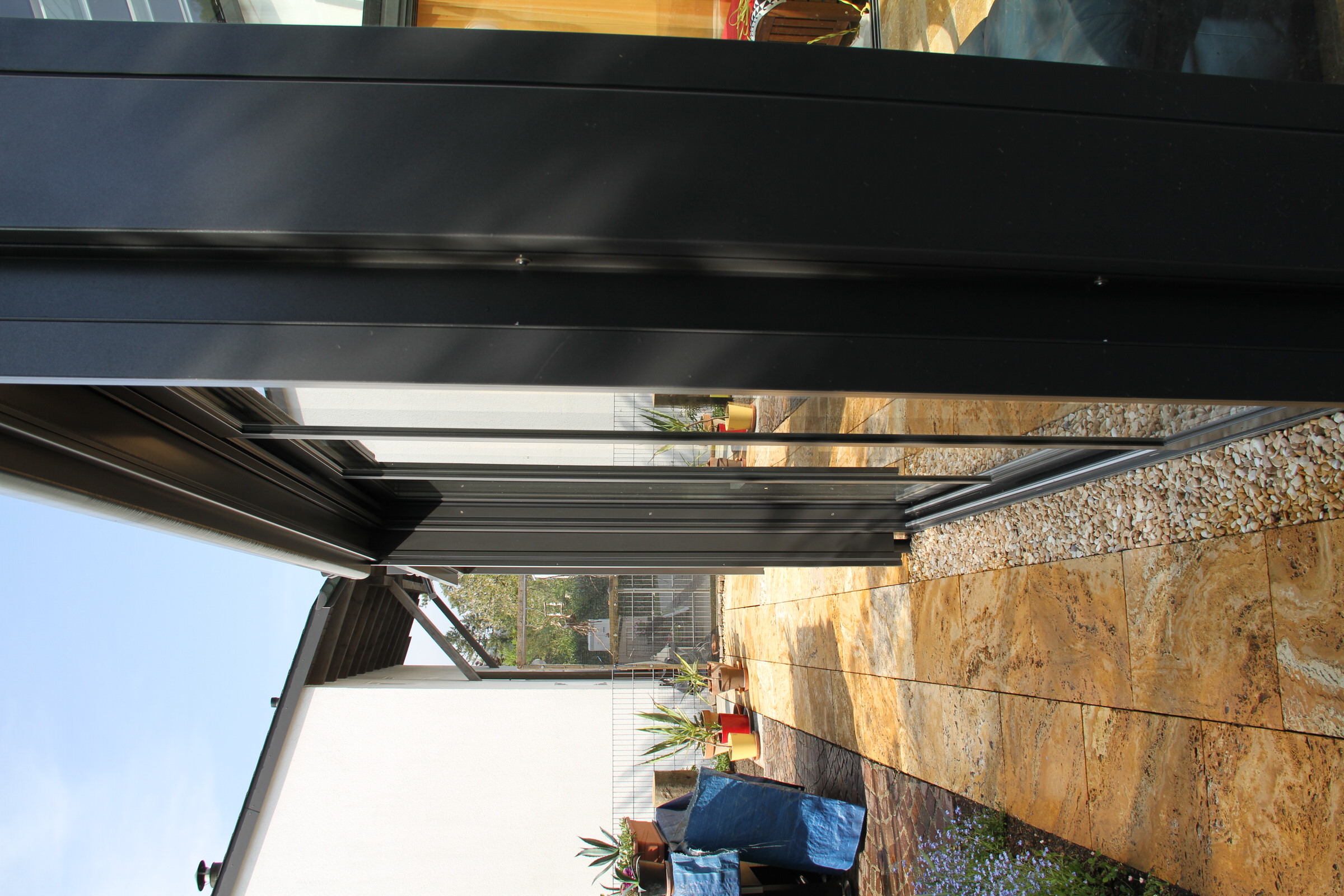 Pultdachförmiges Glasdach mit Isolierverglasung. Wintergarten geschlossen mit Schiebelementen. Windschutz aus Festelement. Mit motorisierter Dach-und Senkrechtbeschattung. Alle Profile lackiert in IGP5803E71386 Anthrazit.