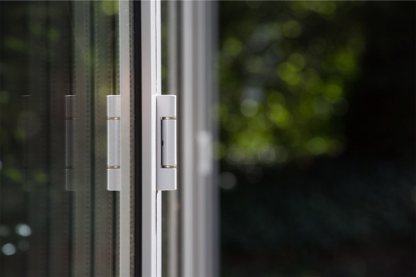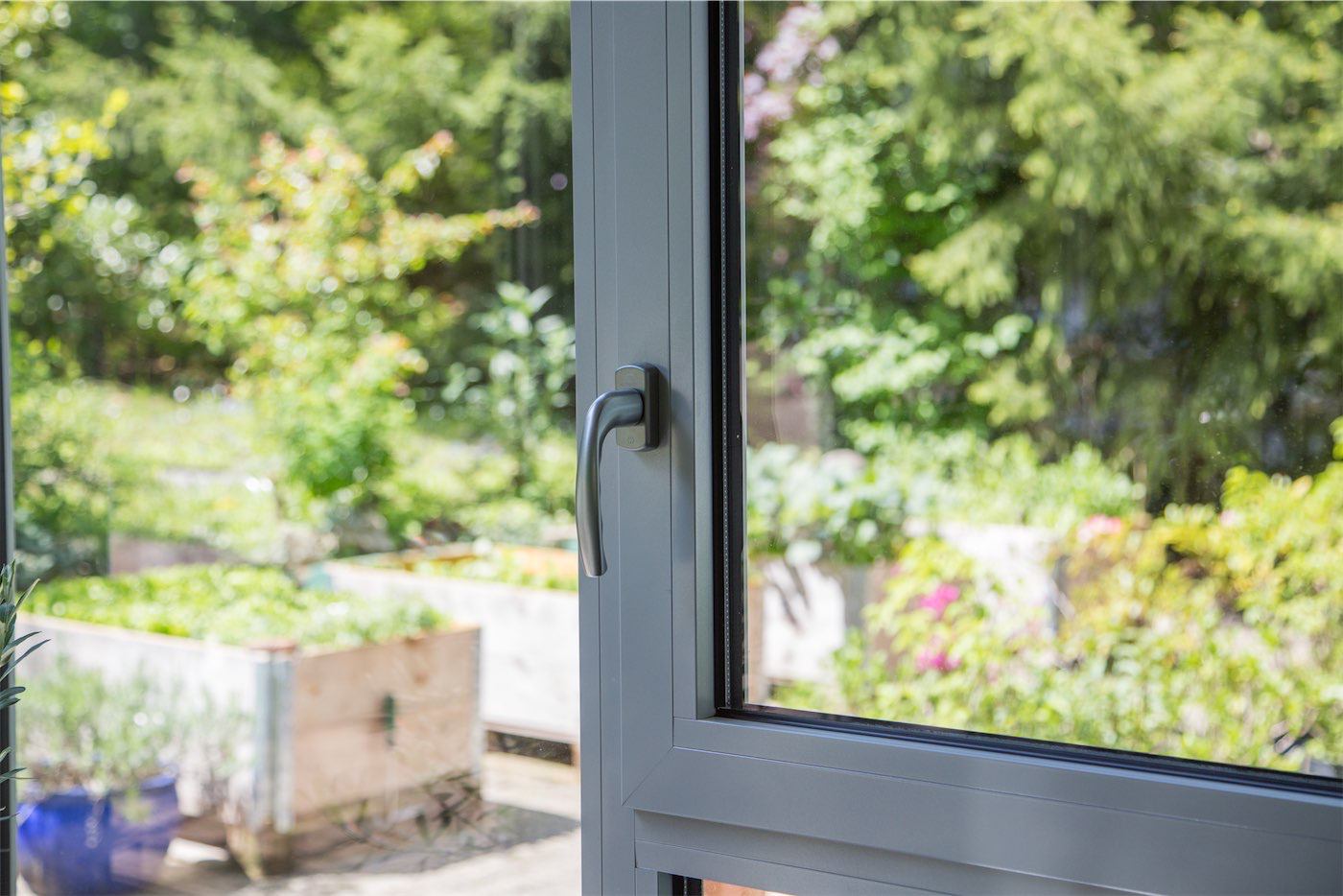 Verglasung im EG mit wärmegedämmter Falt-Schiebewand und Glaselement.