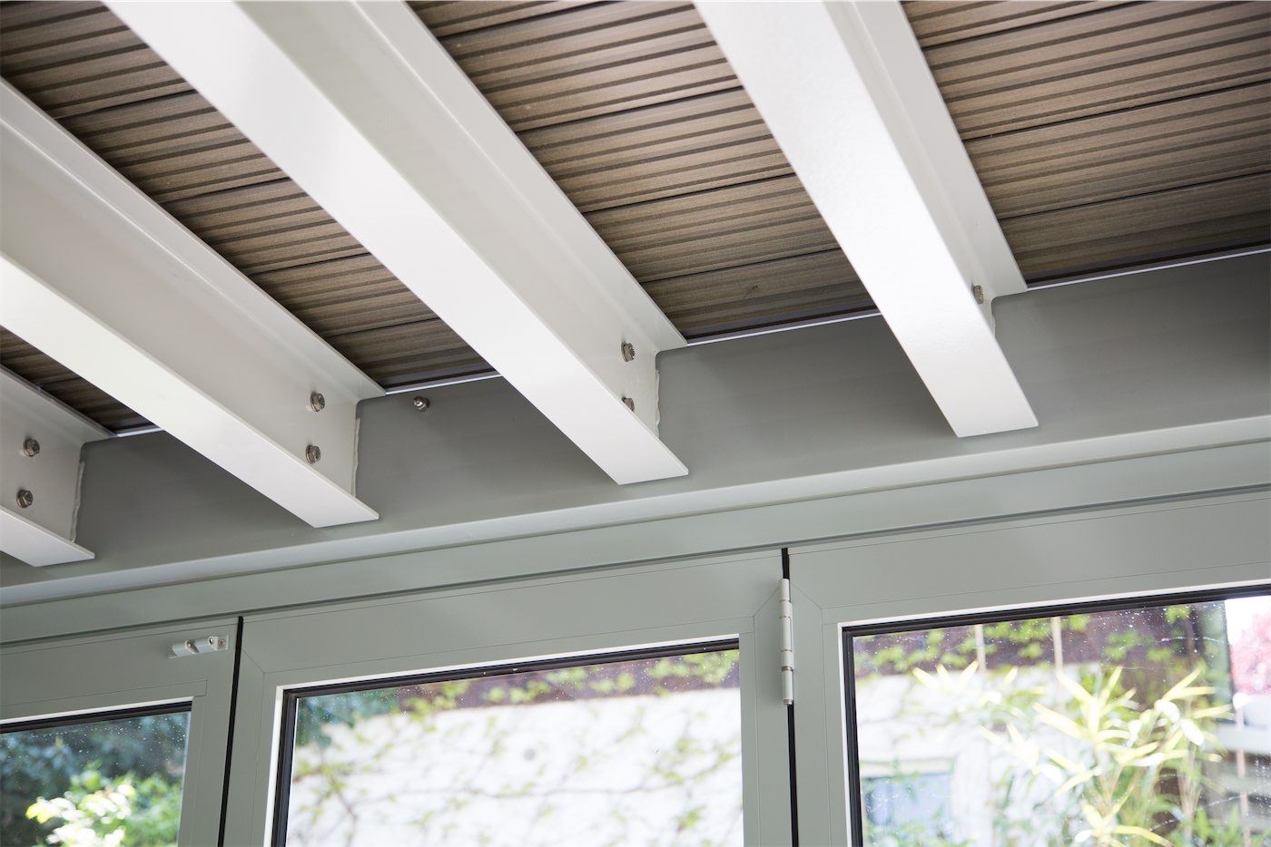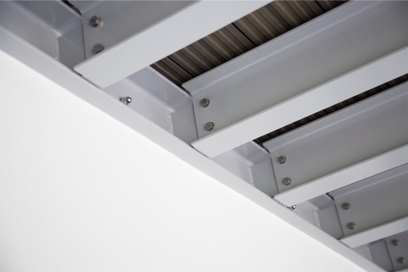 Motorisierte Dach- und Senkrechtbeschattung vollständig in den Storenkasten einfahrbar.